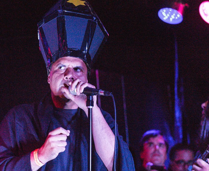 The lighting, his expression, his eyes, the vivid blue. The vertical composition, with Pat filling the left half of the photo in blue from top to bottom, and the mic stand, his arm, the microphone chord (blue in the light) and the blue lit fold in the curtain behind them. All that blue, streaked with black. The faces down there (hello, Bob Lee) in that slightly out of focus corner. This is a perfect photo. One of those once in a life time shots. Pat should have this on his wall, framed. It’s that good. It begs to be an 8×10 glossy hung up in his favorite bar. He could autograph the damn things. And while I have no idea who took the photo, I assume it was a professional, using a real camera. I doubt it was just random luck. I just want to thank them.