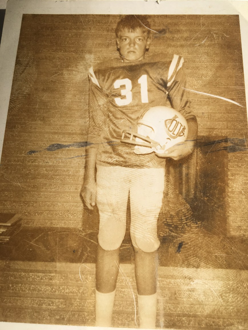 Oh wow, I didn’t even know this picture existed. It’s me, at 12 or 13, before my first Pop Warner game. Think I was a tackle, and had just spent a couple weeks practicing in 90 degree September heat in Brea, California. Brutal. Then came the pre-season scrimmage. It was a Friday night and the field was lit up bright as day. Hundreds of people in the stands, there not being much to do in a hick town. My childhood memory is shot to hell from seizures and I remember almost everything back then like a fading dream, so the details of the game are sketchy. There were a couple plays and nobody was getting anywhere. Then the ball was snapped again, somebody fumbled and it landed bouncing at my feet and I jumped on it but someone kicked it loose. Too late: every single kid on the field dogpiled on top of me. Down there at the bottom of that pile of squirming kids I felt my knee pop. Dislocated. It was agony for a minute or three.