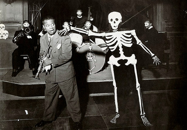 Later, candy gone, we turned out the lights, shut the door and retreated to the inner sanctum. Time to stretch. Fyl flips through a beautiful volume of Herman Leonard, the pictures of long gone jazz players are black & white and ill lit, full of shadows, smoke haunting the frame like ghosts. Miles Davis blowing behind us, cooking, Trane comes in blowing sudden rushes up and down the scale, but Miles owns the session. Elliott stops to listen to a particularly good passage. His fingers work the solo. It’s all about Miles tonight. Fifties Miles, Prestige Miles. No Lee Morgan this year. It’s the Prince of Darkness. Fyl shows us a Herman Leonard photo. Miles with trumpet, glaring. Jazz noir. Day of the Dead. Elliott starts telling us about another old jazz cat who had died, a player, can’t recall the name now, and how his son had just given him the old man’s record collection. Two big boxes full of amazing albums. We’re flipping through them and sampling some on the turntable. All kinds of great 1950’s stuff, a lot of west coast cool, and we’re digging the sounds and the wind is blowing and shivering branches tap the window. Fyl says they’re calling us. Who? The dead. The dead? The dead jazz musicians, she says. All the ones in this book. They want to come in. We laugh when an incredible trombone solo comes out of nowhere. Frank Rosolino, on cue, on Halloween. Properly sensitized, we sit in the dark, listening to the wind and the bones and telling scary Frank Rosolino stories. A jazzman Halloween.